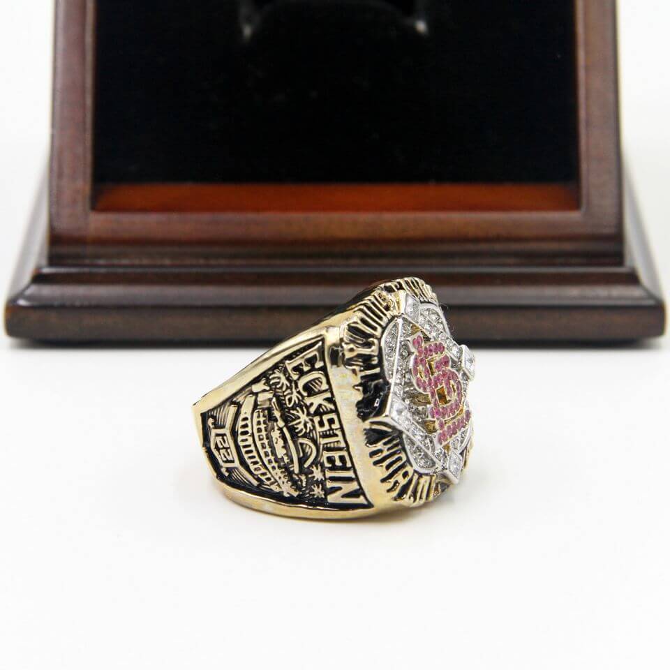 MLB 2006 St. Louis Cardinals World Series Championship Replica Fan Ring with Wooden Display Case includes a 2011 St. Louis Cardinals World Series championship rings which is the most recent champions. A beautiful wooden display case with slanted glass window to make the rings display with pride and representing the honor of the team. It the best item to memorize the great time of St. Louis Cardinals defeated the Detroit Tigers by 4:1 during October 21th to 27th in 2006 It is a unique and a great gift to your friends and families, and this is a truly one of a kind item that would stand out in any St. Louis Cardinals fans collection