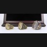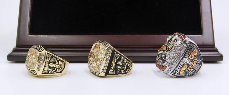 NFL 1997 1998 2015 Denver Broncos Super Bowl Championship Replica Fan Rings with Wooden Display Case Set includes three Denver Broncos Super Bowl championship rings, which are 1997 NFL Super Bowl XXXII, 1998 NFL Super Bowl XXXIII,2015 NFL Super Bowl L