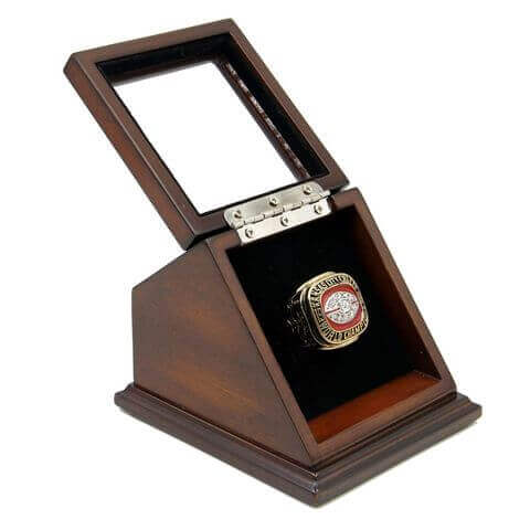 This item also includes a beautiful wooden display case with slanted glass window to make the rings display with pride. It is a unique and a great gift to your friends and families, and this is a truly one of a kind item that would stand out in any Kansas City Chiefs football fans collection.